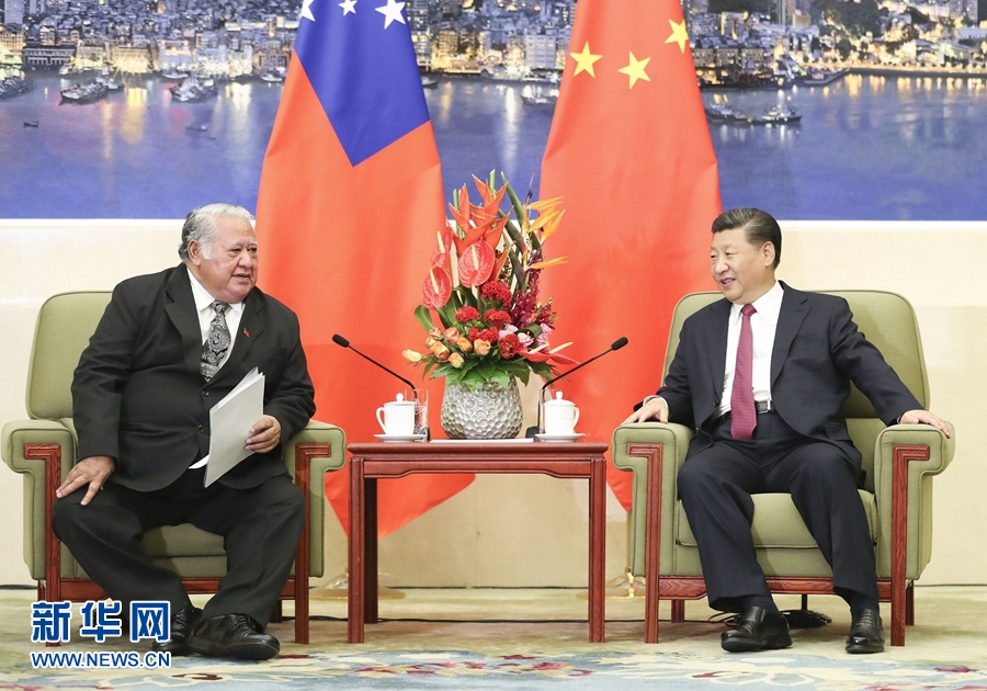 9月18日,國家主席習近平在北京人民大會堂會見來華出席夏季達沃斯論壇的薩摩亞總理圖伊拉埃帕。 新華社記者丁林攝