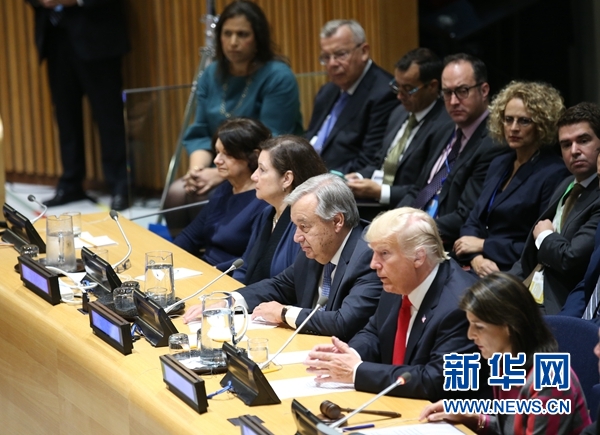 9月24日,在紐約聯(lián)合國總部,聯(lián)合國秘書長古特雷斯(前排右三)出席“呼吁全球采取行動應(yīng)對世界毒品問題”高級別會議。新華社記者秦朗攝
