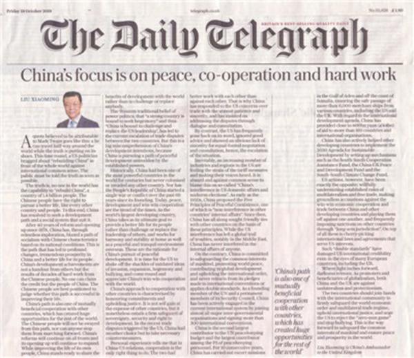 英國時(shí)間10月19日,英國主流大報(bào)《每日電訊報(bào)》紙質(zhì)版和網(wǎng)絡(luò)版同時(shí)刊登我駐英國大使劉曉明題為《中國致力于和平、合作與奮斗》的署名文章。全文如下:
