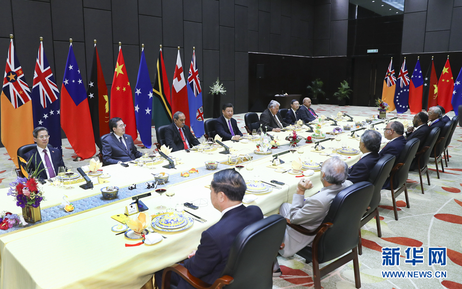 11月16日,國家主席習近平在莫爾茲比港同巴布亞新幾內亞總理奧尼爾、密克羅尼西亞聯邦總統克里斯琴、薩摩亞總理圖伊拉埃帕、瓦努阿圖總理薩爾瓦伊、庫克群島總理普納、湯加首相波希瓦、紐??偫硭冉ń惶窖髰u國領導人以及斐濟政府代表、國防部長昆布安博拉舉行集體會晤。習近平主持會晤并發表主旨講話。 新華社記者 謝環馳 攝