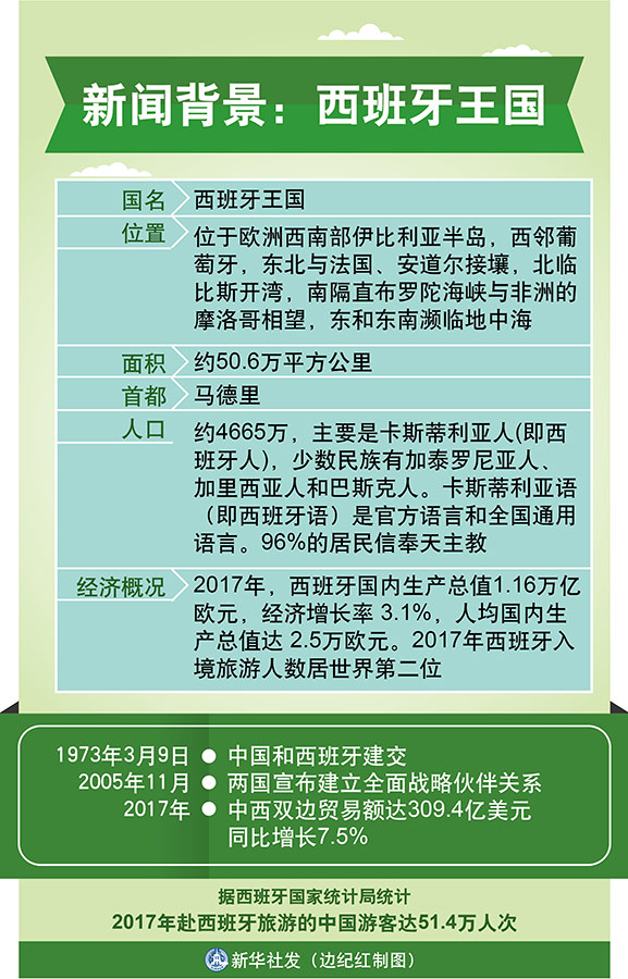 近年來,中西經貿合作持續發展。西班牙是中國在歐盟內第六大貿易伙伴,中國是西班牙在歐盟外第一大貿易伙伴。2017年,雙邊貿易額達309.4億美元,同比增長7.5%。據西班牙國家統計局統計,2017年赴西班牙旅游的中國游客達51.4萬人次。