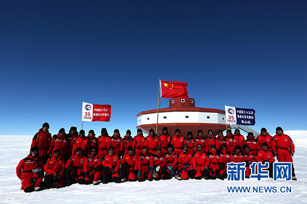 12月26日,中國(guó)第35次南極科學(xué)考察隊(duì)內(nèi)陸隊(duì)(泰山隊(duì)和昆侖隊(duì))隊(duì)員在泰山站主體建筑前升國(guó)旗合影。 新華社記者 劉詩(shī)平 攝