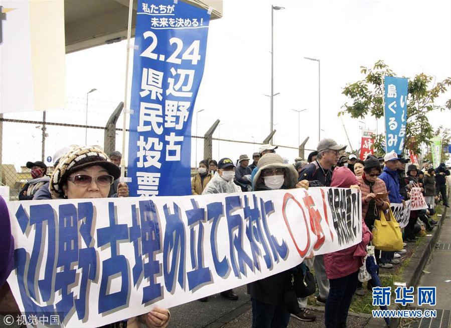 當地時間2019年1月26日,日本沖繩縣名護,民眾在美國海軍陸戰隊施瓦布軍營門前舉行集會,呼吁在2月24日的地方公投中投票反對美國海軍陸戰隊普天間空軍基地的搬遷計劃。(圖片來源:視覺中國)