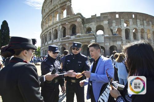 2016年5月2日,中方警員與意大利同行在羅馬斗獸場外執行聯合巡邏。新華社記者金宇攝