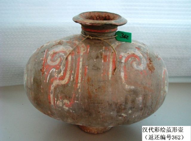 這是漢代彩繪繭形壺(返還編號(hào)362),圖案為對稱幾何紋。