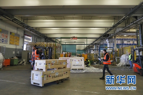 4月9日,在意大利米蘭馬爾彭薩機場,工作人員將中國流失文物藝術品運送上飛機。 新華社記者 程婷婷 攝
