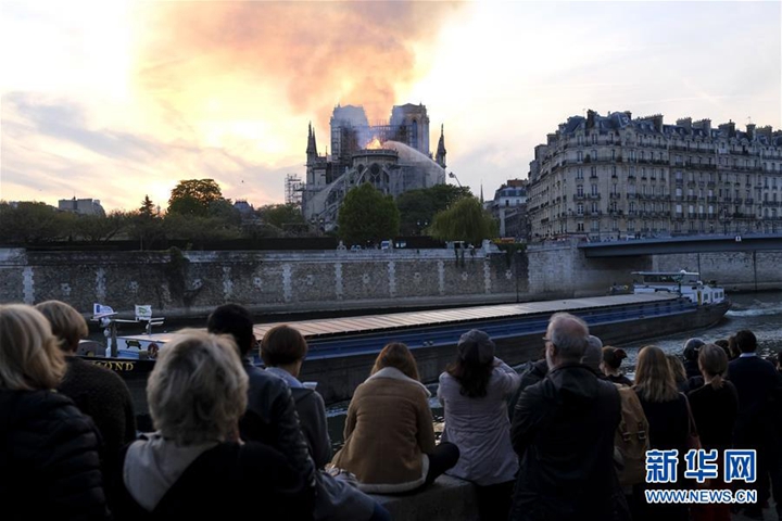 4月15日,在法國巴黎,人們圍觀著火的巴黎圣母院。新華社發(亞歷山大·卡曼 攝)