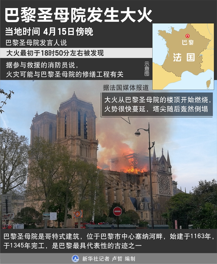 新華社巴黎4月15日電(記者唐霽 徐永春)位于法國首都的巴黎圣母院15日傍晚發生大火,造成巴黎圣母院塔尖倒塌,建筑損毀嚴重。目前尚無人員傷亡的報告。