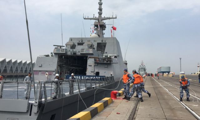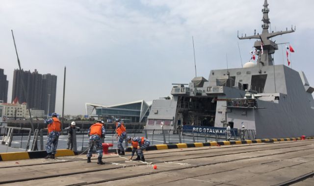 19日10時許,新加坡海軍“堅強”號護衛艦緩緩駛入青島大港碼頭。這是參加中國人民解放軍海軍成立70周年多國海軍活動到訪的第一艘外國海軍艦艇。新華社記者梅世雄 攝