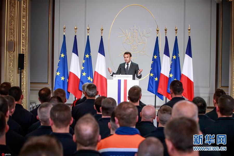 當地時間2019年4月18日,法國巴黎,法國總統馬克龍在愛麗舍宮接見參與巴黎圣母院火災救援任務的消防員。(圖片來源:東方IC)