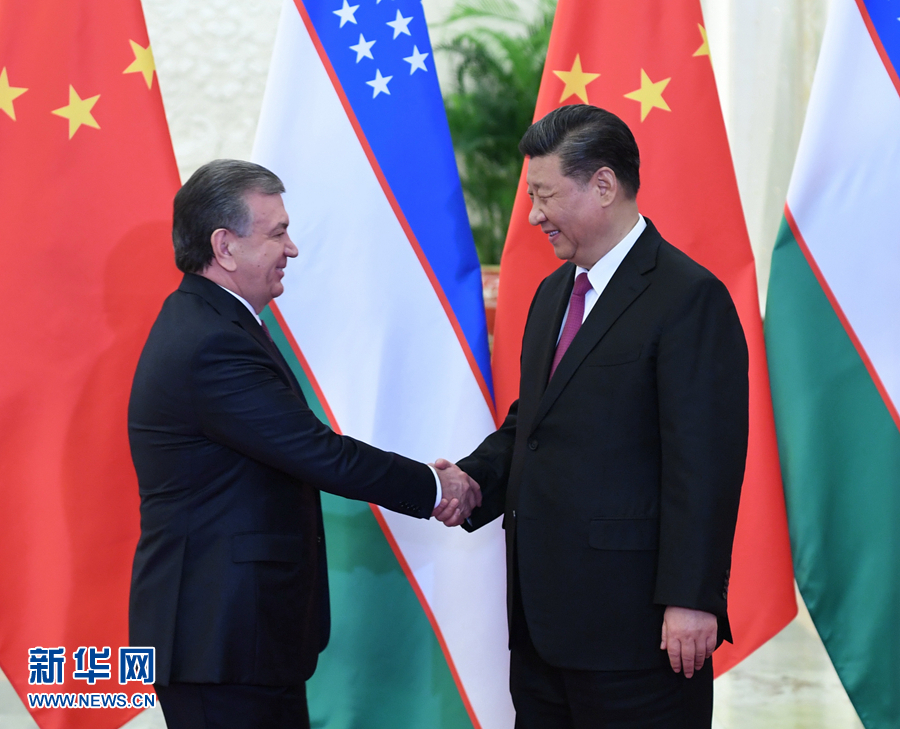4月25日,國家主席習近平在北京人民大會堂會見烏茲別克斯坦總統(tǒng)米爾濟約耶夫。 新華社記者 殷博古 攝