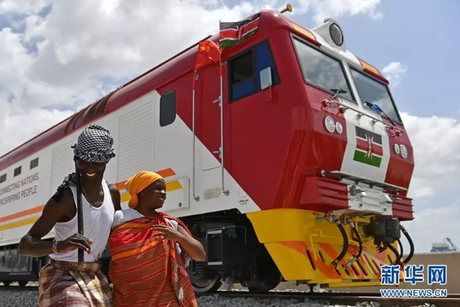 2017年1月11日,在肯尼亞蒙巴薩,當?shù)孛癖娫谥袊兄频拿蓛?nèi)鐵路首批內(nèi)燃機車旁載歌載舞。新華社記者孫瑞博攝