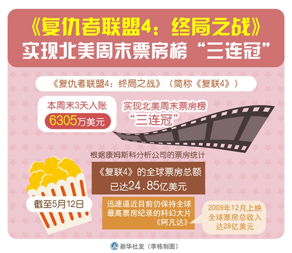 根據康姆斯科分析公司的票房統計,截至5月12日,《復聯4》的全球票房總額已達24.85億美元,迅速逼近目前仍保持全球最高票房紀錄的科幻大片《阿凡達》。2009年12月上映的《阿凡達》由著名導演詹姆斯·卡梅隆執導,全球票房總收入達28億美元。