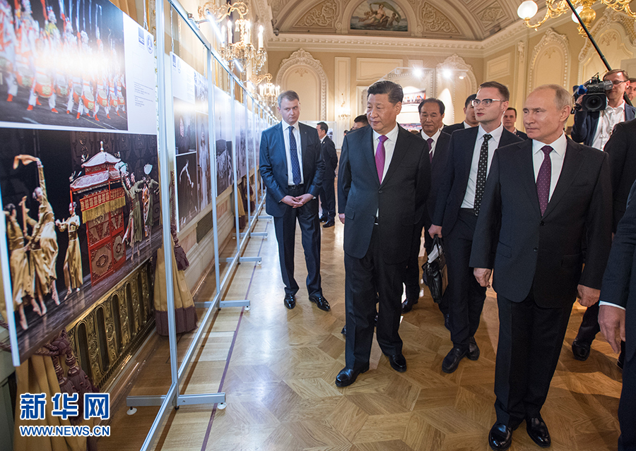 6月5日,國家主席習近平和俄羅斯總統普京在莫斯科大劇院共同出席中俄建交70周年紀念活動。這是兩國元首共同參觀中俄建交70周年圖片展。 新華社記者 李學仁 攝