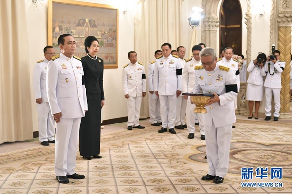 6月11日,在泰國(guó)曼谷,相關(guān)工作人員來(lái)到總理府對(duì)泰國(guó)總理巴育(前左)宣讀國(guó)王圣諭。新華社發(fā)