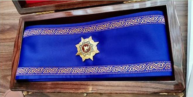 這就是授予習(xí)近平主席的勛章。“瑪納斯”勛章是吉爾吉斯斯坦國家最高獎?wù)拢杉獱柤顾固箍偨y(tǒng)授予,分三個(gè)等級,一級為最高等級。新華社記者 丁林 攝
