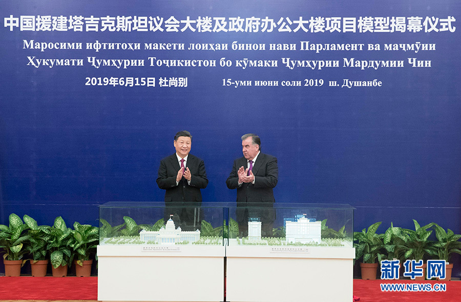 6月15日,國家主席習(xí)近平在杜尚別同塔吉克斯坦總統(tǒng)拉赫蒙會(huì)談。會(huì)談后,兩國元首共同出席中方援塔議會(huì)大樓、政府辦公大樓項(xiàng)目模型揭幕儀式。 新華社記者 王曄 攝