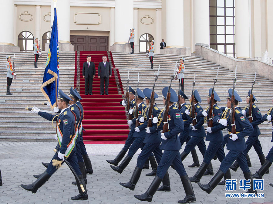 會(huì)談前,拉赫蒙在總統(tǒng)府前廣場(chǎng)為習(xí)近平舉行了盛大歡迎儀式。
