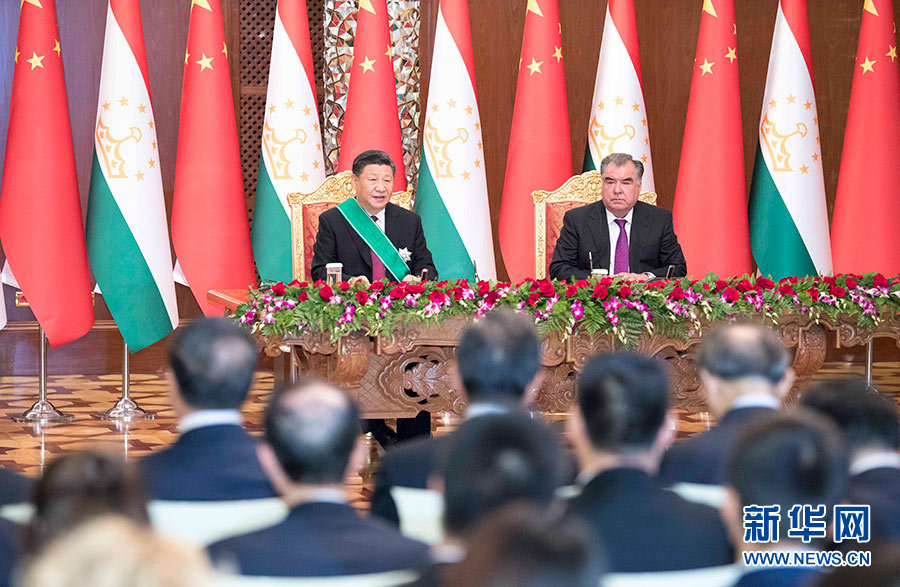 6月15日,國家主席習(xí)近平在杜尚別同塔吉克斯坦總統(tǒng)拉赫蒙會(huì)談。會(huì)談后,兩國元首簽署《中華人民共和國和塔吉克斯坦共和國關(guān)于進(jìn)一步深化全面戰(zhàn)略伙伴關(guān)系的聯(lián)合聲明》。 新華社記者 李學(xué)仁 攝
