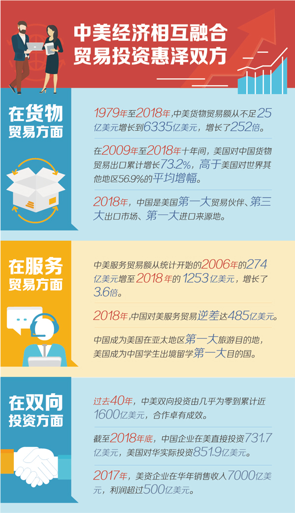 在國(guó)際經(jīng)濟(jì)合作中,正常的貿(mào)易關(guān)系是建立在等價(jià)交換基礎(chǔ)上的互惠互利關(guān)系,而不是你多我少、你輸我贏的“零和博弈”。國(guó)際貿(mào)易有利于推動(dòng)資源在世界范圍內(nèi)優(yōu)化配置,促進(jìn)各國(guó)經(jīng)濟(jì)共同發(fā)展,推動(dòng)人類(lèi)社會(huì)共同進(jìn)步,國(guó)際貿(mào)易的歷史早已證明這樣的實(shí)踐是有效的,實(shí)踐經(jīng)驗(yàn)也早已成為國(guó)際經(jīng)濟(jì)學(xué)的基本原理,中美經(jīng)貿(mào)合作的事實(shí)也作了同樣的驗(yàn)證。中美建交以來(lái),在雙邊貿(mào)易方面,1979年至2018年,雙邊貨物貿(mào)易額從不足25億美元增長(zhǎng)到6335億美元,增長(zhǎng)了252倍;在雙向投資領(lǐng)域,過(guò)去40年,中美雙向投資由幾乎為零到累計(jì)近1600億美元,中美互為對(duì)方重要投資伙伴,投資的雙向性和互惠性進(jìn)一步顯現(xiàn)。中美經(jīng)貿(mào)關(guān)系發(fā)展的歷程證明,中美通過(guò)優(yōu)勢(shì)互補(bǔ)、互通有無(wú),有力促進(jìn)了各自經(jīng)濟(jì)發(fā)展和產(chǎn)業(yè)結(jié)構(gòu)優(yōu)化升級(jí),雙方經(jīng)貿(mào)往來(lái)是惠澤彼此的關(guān)系,而非中國(guó)讓美國(guó)“吃虧”的過(guò)程。