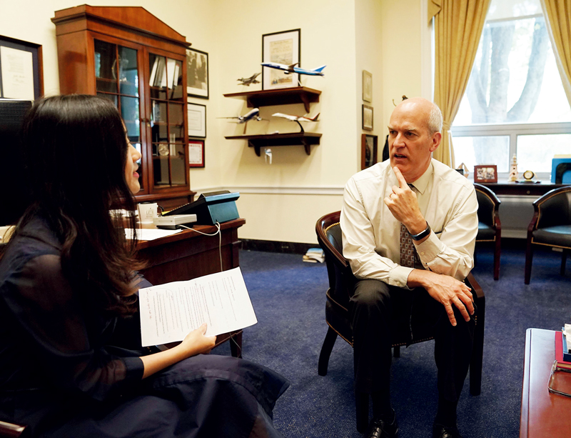 越來(lái)越多美國(guó)有識(shí)之士認(rèn)識(shí)到,美國(guó)政府加征關(guān)稅會(huì)損害美國(guó)民眾利益。圖為2019年5月9日,美國(guó)國(guó)會(huì)眾議院美中工作小組共同主席、華盛頓州民主黨聯(lián)邦眾議員里克·拉森(右)在華盛頓接受采訪(fǎng)時(shí)表示,美國(guó)政府對(duì)華產(chǎn)品加征關(guān)稅的做法損害美國(guó)工人與消費(fèi)者利益,不利于美國(guó)經(jīng)濟(jì),也無(wú)助于解決兩國(guó)經(jīng)貿(mào)問(wèn)題。 新華社記者 劉杰/攝