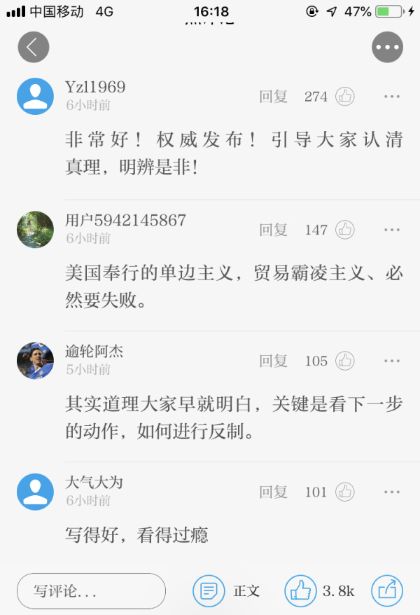 文章刊發后,網友紛紛轉發、點贊,表示“全面、清晰且深刻。”“權威發布!引導大家認清真理,明辨是非!”“美國奉行的單邊主義,貿易霸凌主義、必然要失敗。 ”