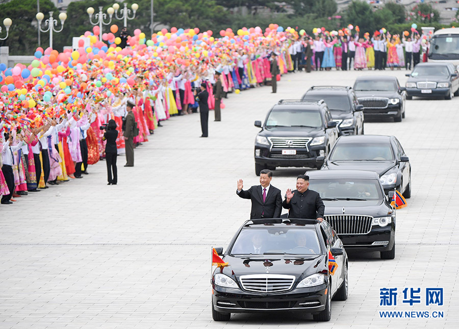 歡迎儀式結(jié)束后,在21輛禮賓摩托車的護(hù)衛(wèi)下,習(xí)近平乘車前往錦繡山迎賓館。沿途數(shù)十萬群眾揮舞中朝兩國國旗和五彩繽紛的鮮花,熱情洋溢地高呼中朝友誼萬歲等口號,夾道歡迎。