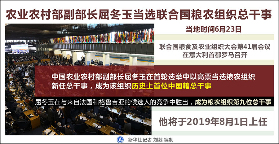 當(dāng)日,屈冬玉在與來自法國和格魯吉亞的候選人的競爭中勝出,成為糧農(nóng)組織第九位總干事。他將于今年8月1日上任。