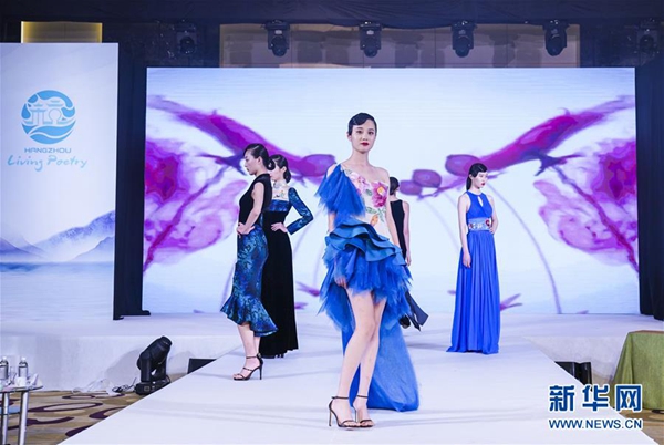 這是7月3日在越南首都河內拍攝的推介會上的絲綢華服秀。新華社發(法鑫 攝)