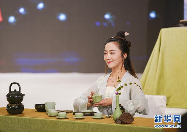 這是7月3日在越南首都河內拍攝的推介會上的茶藝表演。新華社發(法鑫 攝)