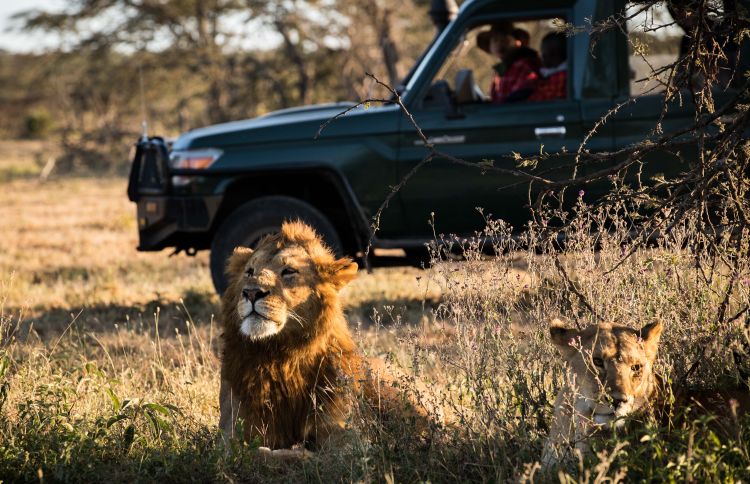2018年7月7日,在肯尼亞馬賽馬拉大草原奧肯耶保護區,星巴和當地巡邏員觀察獅群情況。新華社記者呂帥攝