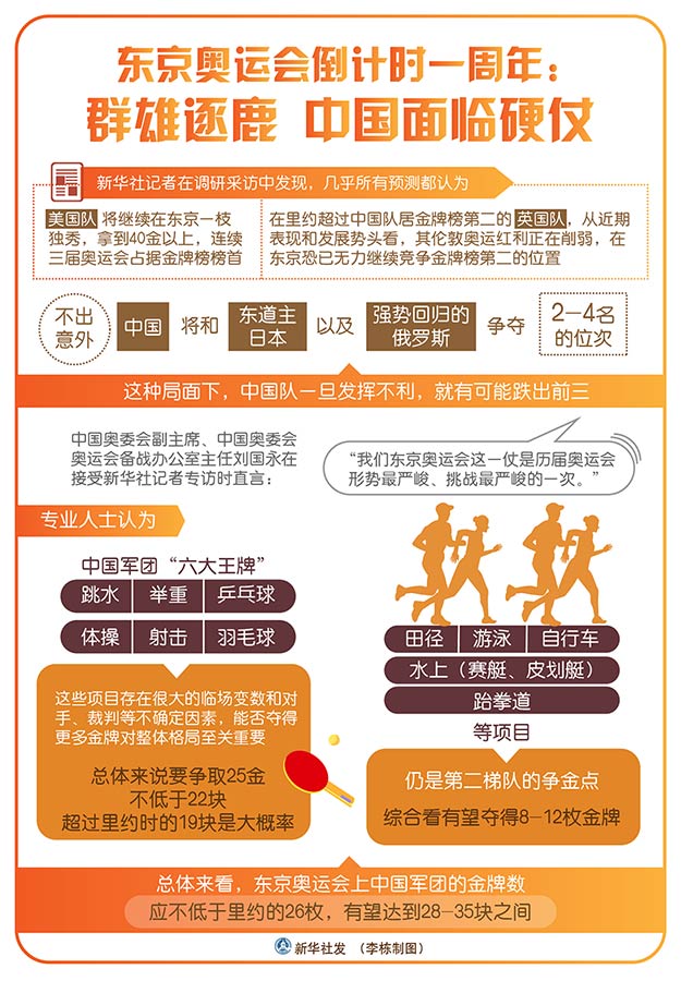 新華社記者在調研采訪中發現,幾乎所有預測都認為,美國隊將繼續在東京一枝獨秀,拿到40金以上,連續三屆奧運會占據金牌榜榜首。而在里約超過中國隊居金牌榜第二的英國隊,從近期表現和發展勢頭看,其倫敦奧運紅利正在削弱,在東京恐已無力繼續競爭金牌榜第二的位置。