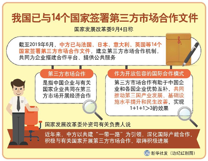 新華社北京9月4日電(記者安蓓)國家發展改革委4日稱,截至2019年6月,中方已與法國、日本、意大利、英國等14個國家簽署第三方市場合作文件,建立第三方市場合作機制,共同為企業搭建合作平臺、提供公共服務。