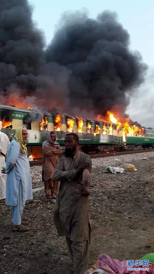 10月31日,在巴基斯坦拉希姆亞爾汗,人們站在起火的列車旁。巴基斯坦官方救援機(jī)構(gòu)說,巴一輛旅客列車31日在巴東部旁遮普省拉希姆亞爾汗地區(qū)起火,目前已導(dǎo)致至少65人死亡,14人受傷。 新華社發(fā)