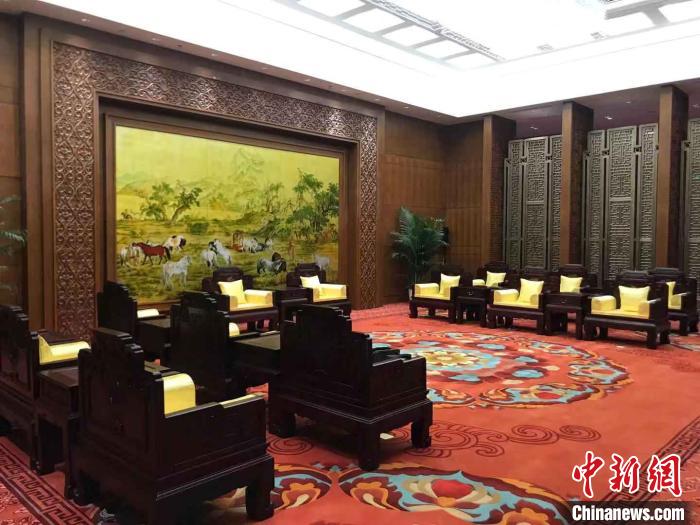 陳玉樹介紹,《松風》的創(chuàng)作靈感源自宮廷舊藏——乾隆時期紫檀嵌玉寶座。作品采用世界名貴木材和純手工雕刻工藝,其椅面寬大,直靠背,搭腦后延似卷書狀,上雕蝙蝠銅錢周邊輔以拐子龍圖樣,寓意“福壽雙全”。扶手兩側(cè)均刻以松枝寓長青不老、堅韌忠貞之意。靠背板以高超的“絲翎檀雕”工藝雕以“松鶴延年圖”。后背板更雕以“五福捧壽”圖樣,前后呼應,福壽雙至。座面下打洼束腰,拐子紋飾直牙條,方腿直下,半部略呈鼓腿后順沿而下外翻祥云紋馬蹄足。整套造型體量寬大,紋飾繁復,具有典型的清式家具特色。