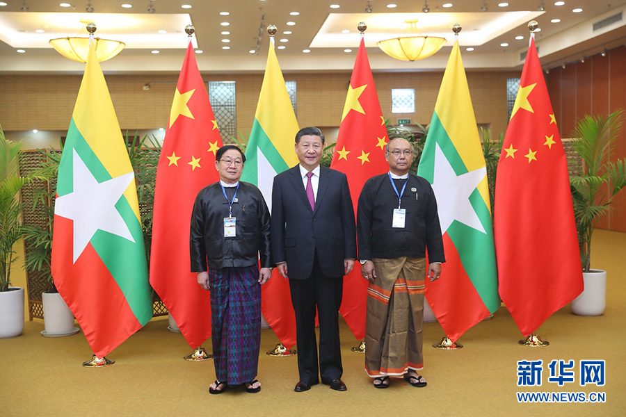 當晚,習近平同緬甸聯邦議會議長兼人民院議長蒂昆密和民族院議長曼溫凱丹進行了友好交談,并和緬甸主要政黨領導人集體合影留念。