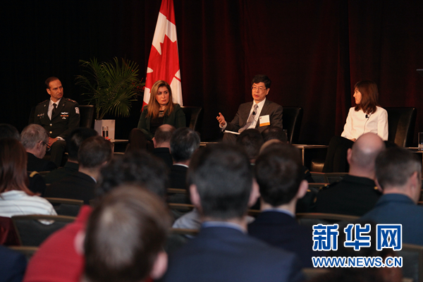 圖為中國駐加拿大大使叢培武(右二)在渥太華安全與防務會議上回答問題。記者李保東 攝