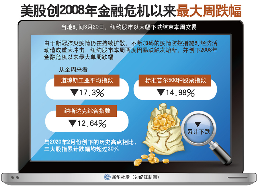 由于新冠肺炎疫情仍在持續擴散,不斷加碼的疫情防控措施對經濟活動造成重大沖擊,紐約股市本周兩度因暴跌觸發熔斷,并創下2008年金融危機以來最大單周跌幅。