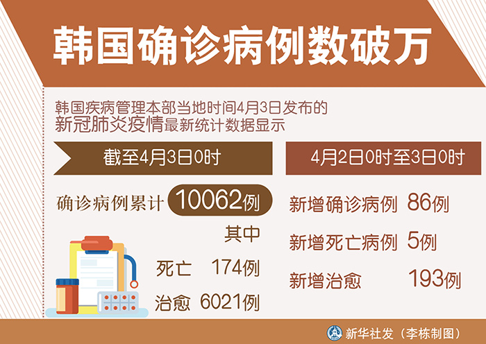新華社首爾4月3日電(記者陸睿)韓國疾病管理本部3日發布的新冠肺炎疫情最新統計數據顯示,截至3日0時,韓國確診病例累計達10062例,其中死亡174例,治愈6021例。