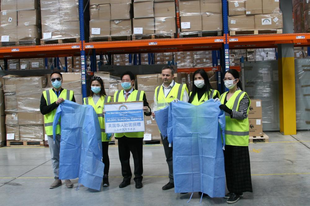 2020年4月20日,英國華僑華人社團向英方捐贈醫用防護服。(新華社發)