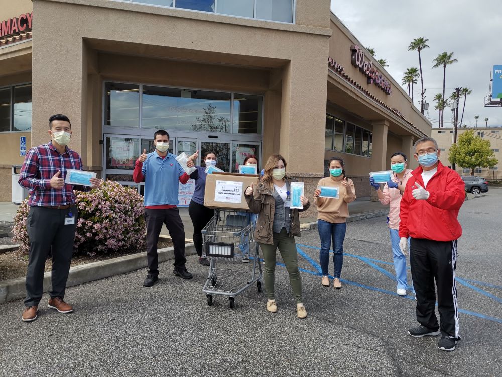 2020年4月7日,在美國洛杉磯縣天普市,美國南加州華人聯合總會代表向當地一家藥店捐贈口罩時合影。(新華社發)