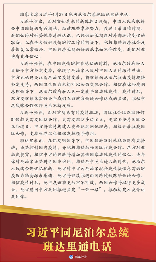 習近平強調,在中國疫情防控最吃勁的時刻,尼泊爾政府和人民給予中方堅定支持,體現(xiàn)了尼泊爾人民對中國人民的深情厚誼。中方也始終關注著尼泊爾疫情發(fā)展,將繼續(xù)向尼泊爾抗擊疫情提供堅定支持,兩國衛(wèi)生醫(yī)療機構可以加強交流合作。相信在你和奧利總理領導下,尼泊爾政府和人民一定能早日戰(zhàn)勝疫情。疫情過后,雙方要繼續(xù)落實好去年我們互訪就各領域合作達成的共識,推動中尼戰(zhàn)略合作伙伴關系不斷發(fā)展。
