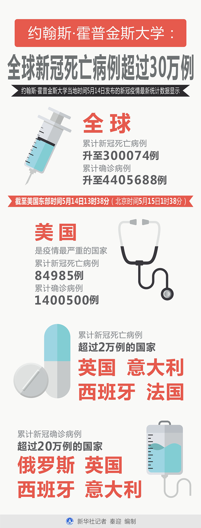 新華社北京5月15日電 ?14日全球疫情簡報:美研究機構統計美國新冠確診超140萬 全球病亡超30萬