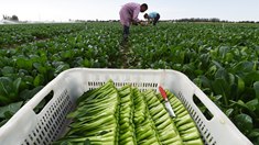 3月2日,一名外國員工(右)在科威特杰赫拉省的葛洲壩集團項目工地領取防疫口罩。新華社發(劉梁皓月 攝)