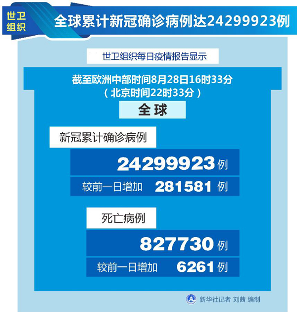 世衛組織網站最新數據顯示,截至歐洲中部時間28日16時33分(北京時間22時33分),全球確診病例較前一日增加281581例,達到24299923例;死亡病例增加6261例,達到827730例。