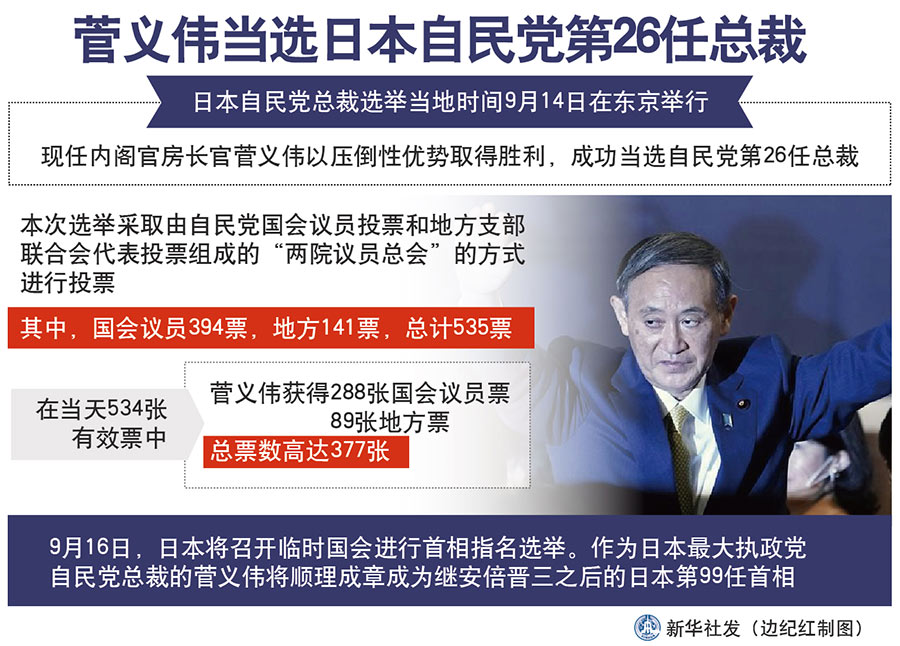 新華社東京9月14日電(記者郭丹)日本自民黨總裁選舉14日在東京舉行?,F(xiàn)任內(nèi)閣官房長官菅義偉以壓倒性優(yōu)勢取得勝利,成功當(dāng)選自民黨第26任總裁。
