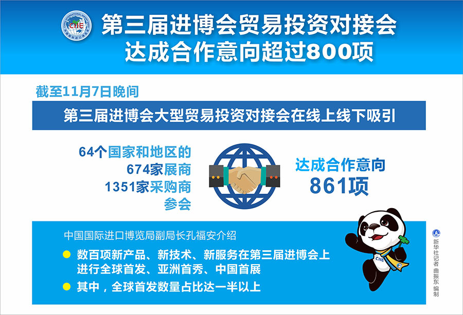新華社上海11月8日電(記者周蕊、于佳欣)記者8日從第三屆中國國際進口博覽會展中新聞通氣會上了解到,截至7日晚間,第三屆進博會大型貿易投資對接會在線上線下吸引64個國家和地區的674家展商、1351家采購商參會,達成合作意向861項。