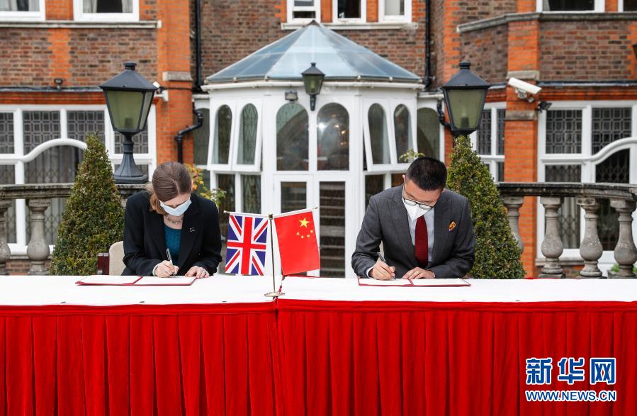 10月16日,在英國(guó)倫敦,代表中國(guó)國(guó)家文物局的中國(guó)駐英國(guó)大使館文化處一秘于果(右)和代表英國(guó)大都會(huì)警察局的探員蘇菲·海斯簽署文物接收確認(rèn)書。新華社記者 韓巖 攝
