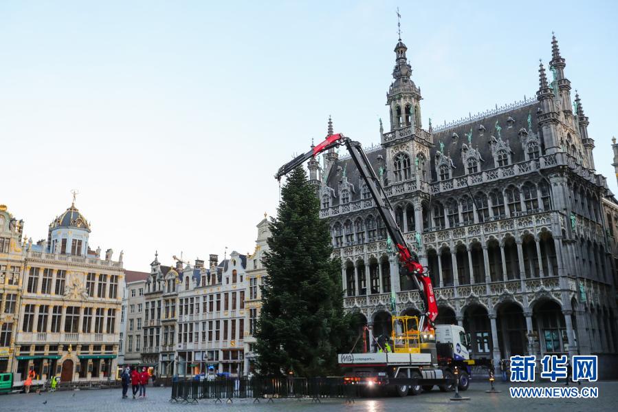 這是11月19日在比利時布魯塞爾大廣場拍攝的圣誕樹安裝現場。