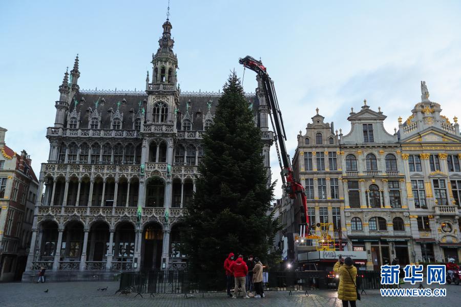 這是11月19日在比利時布魯塞爾大廣場拍攝的圣誕樹安裝現場。